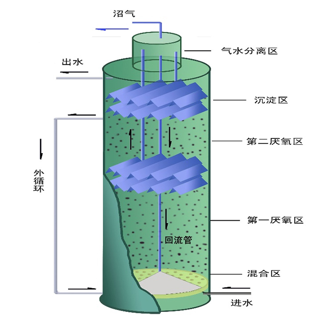 废水进入反应器,与分配系统中的颗粒污泥混合。有机化合物转化为甲烷(沼气)后,沼气被收集到下层三相分离器中,产生气提,液体与沼气一起沿上升管向上流动。沼气在顶部气液分离器中脱除,水则通过下降管返回分配系统,因此被称为“内循环”。废水在两层三相分离器之间继续进行净化后流出反应器,沼气被收集到上层三相分离器中。